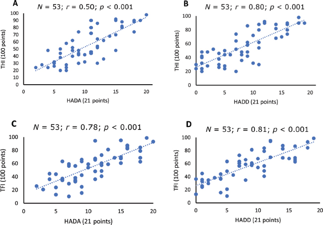 Pearson's correlation coefficient (r) was used to identify and evaluate the strength of the relationship between the variables. Correlation factors showed a strong relationship between all anxiety (HADA) and depression (HADD) variables and the THI and TFI scores.