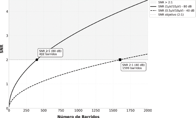 Una de las estrategias más efectivas para mejorar la fiabilidad del registro es aumentar el número de promediaciones. Cada barrido adicional reduce progresivamente el impacto del ruido, favoreciendo la detección de la señal. Esta relación se describe mediante la siguiente ecuación, descrita por Hall (2007, p. 95):