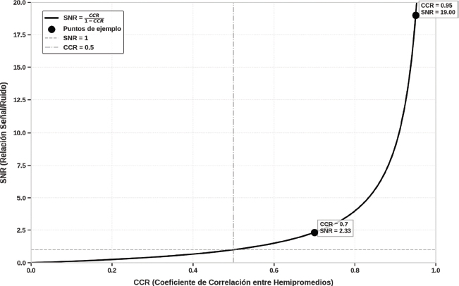 Esta ecuación establece que el CCR no solo mide la consistencia entre hemipromedios, sino que también actúa como un indicador directo de la preponderancia de la señal sobre el ruido. A medida que el CCR se aproxima a 1, el SNR aumenta de forma no lineal, lo que refleja una señal cada vez más dominante en comparación con el ruido. En la Figura 2 observamos que un CCR de 0.7 resulta en un SNR de 2.3 dB, mientras que un CCR de 0.95 incrementa el SNR a 19 dB, mostrando un crecimiento exponencial. Por el contrario, valores bajos de CCR, cercanos a 0, implican un dominio del ruido sobre la señal, lo que limita la interpretación del registro.