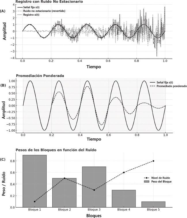 Figura 3. Representación esquemática del principio de promediación ponderada, basada en una simulación temporal de una respuesta ficticia. (A) Registro simulado con contaminación por ruido no estacionario, en el que una señal fija s(t) se ve afectada por un componente de ruido xi(t) de intensidad variable. (B) Implementación de la técnica de promediación ponderada, en la que el registro se segmenta en bloques y se asignan coeficientes de ponderación en función del SNR de cada segmento. Los bloques con menor interferencia y mayor coherencia con la señal de interés contribuyen de manera más significativa al promedio final. (C) Distribución de los pesos asignados a los bloques en función del nivel de ruido, ilustrando la estrategia de optimización del aporte relativo de cada segmento en el proceso de estimación de la señal subyacente.