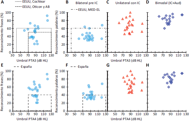 Figura 2. A. Reconocimiento de frases en silencio en la mejor condición de escucha (con dos audífonos) en función del PTA3 en el oído que posteriormente recibirá un IC (N=22). Los umbrales audiométricos se midieron sin amplificación. Las líneas de puntos y rayas representan los criterios actuales de indicación de IC según el país y la marca. Cinco participantes no cumplían con los criterios para recibir un IC de las marcas Cochlear, Oticon o Advanced Bionics en Estados Unidos. B. Como el panel A, pero para el reconocimiento de palabras CNC. C. Reconocimiento de palabras CNC en silencio tras recibir un IC (duración media de uso 17,9 meses). El reconocimiento se midió presentando las palabras sólo en el oído con IC, y se representa en función de los umbrales audiométricos obtenidos para el mismo oído antes de la implantación. D. Como el panel C, pero cuando los participantes usaban IC en un oído y audífono en el otro. E-H. Como los paneles A-D pero en función del PTA4. AB: Advanced Bionics. Datos obtenidos de Gifford et al. (2010).