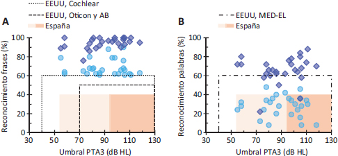 La FDA indica que la evaluación de un paciente que va a recibir un implante de MED-EL debe realizarse con palabras en lugar de frases. En concreto, el reconocimiento de palabras debe ser ≤ 50 % en el oído que se va a implantar y ≤ 60 % en el oído no implantado para que un adulto con pérdida auditiva bilateral reciba un implante de esta compañía (Tabla 1). Como referencia, hemos indicado el criterio de MED-EL como reconocimiento bilateral ≤ 60 % en la Figura 2B, ya que es probable que si el reconocimiento bilateral es ≤ 60 %, el reconocimiento en el oído no implantado o implantado también lo sea. Por tanto, todas las personas del estudio de Gifford et al. (2010), excepto dos, serían candidatas a IC de MED-EL en Estados Unidos. Desconocemos si esas dos personas cumplirían los criterios cuando se evalúa cada oído por separado.