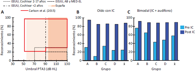 Figura 4. A. Características de los participantes incluidos en el estudio de Carlson et al. (2015) (línea roja). Las líneas de puntos y rayas indican los criterios actuales, según el país y la marca, para considerar a una persona con hipoacusia bilateral menor de 18 años como candidata a IC. El área naranja oscuro indica que una persona <18 años con ese PTA3 recibiría un IC en España, y el área naranja claro indica que una persona con ese PTA3 podría recibir un IC en España, dependiendo de si al promediar con 4 kHz el PTA4 es >70 dB HL. B. Rendimiento medio en las tareas de reconocimiento de palabras y frases antes (barras celestes) y después (barras azules) de recibir un IC. Resultados cuando los estímulos se presentaron en el oído implantado. Grupo A: PTA3 <70 dB HL (o <90 dB HL para niños menores de 2 años) en el oído con IC (N = 8). Grupo B: PTA3 <70 dB HL (o <90 dB HL en niños menores de 2 años) en el oído contralateral (N = 19). Grupo C: >30% de reconocimiento en el oído que se va a implantar en pruebas de palabras/frases apropiadas para la edad (N = 24). Grupo D: >30% en la mejor condición de escucha antes de la implantación (N = 42). x̄ = Media. C. Como el panel B, pero cuando el habla se percibía con dos oídos (IC y audífono contralateral). Datos obtenidos de Carlson et al. (2015). AB: Advanced Bionics.