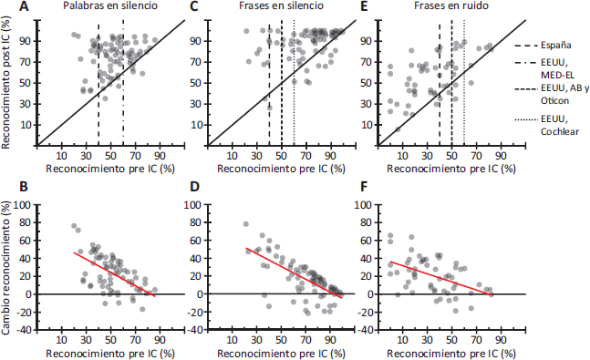 La Figura 5A muestra que el reconocimiento de palabras en silencio mejoró del 52 % antes de la implantación al 75 % a los 6-12 meses tras la activación del IC (N=83). La Figura 5B muestra que la mayoría de los participantes mostró mejor reconocimiento tras recibir el IC (valores por encima de cero), y que la mejora aportada por el IC decrece cuanto mayor es el rendimiento antes de recibir el IC, no aportando beneficio a aquellas personas con un rendimiento pre-IC del 90 % (Figura 5A). Para las frases AzBio en silencio (N=80), la puntuación media aumentó del 70 % antes de la implantación al 87 % a los 6-12 meses tras la activación del IC (Figura 5C). Por otro lado, el beneficio aportado por el IC decrece al aumentar el rendimiento (Figura 5D), al igual que ocurre con las palabras. Además, la Figura 5C muestra que había más personas que mostraban un efecto techo (100 % de reconocimiento) antes de la implantación con frases que con palabras (Figura 5A), en consonancia con los estudios descritos en los apartados anteriores, y que pocas serían candidatas a IC si su rendimiento se evaluara con frases en silencio. No obstante, si su rendimiento se evaluara con frases en ruido, muchas de esas personas serían candidatas a IC (Figura 5E). Además, la mayoría de ellas obtendrían mejor rendimiento con un IC y un audífono que con dos audífonos (Figura 5F). Por lo tanto, los resultados sugieren que el IC puede mejorar significativamente el reconocimiento de habla en ruido.
